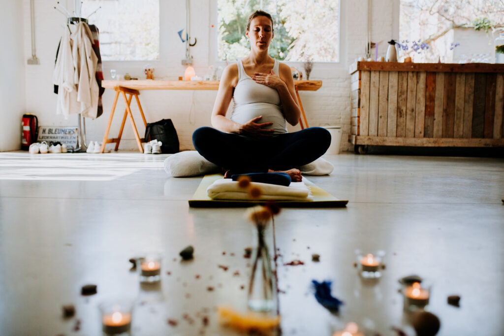 This practice can be done anywhere at any time and in any position. However, the breath will flow more easily and fully if you sit with your hips a little higher than your knees and let your spine grow tall. With your eyes open or closed, soften your gaze, place one hand at the heart centre and one hand on your baby. Take a few slow deep breaths being aware of the movement in your chest and belly as your breath slows and deepens Turn your attention inwards to feel the deep love connection radiating between you, cultivate this bond by being in the present moment with your baby. If you like you can silently greet your baby with words or just an inward smile.