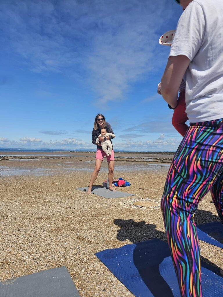 So what actually happens in a Forest Babies or Beach Babies class?  Each hour long session is similar but different and always begins with a short walk through the forest or along the beach to a quiet spot with yoga mats set out. In Forest Babies, we “forest bathe”.  This is based on the Japanese Shinrin-yoku in which one tries to soak up as much of nature as possible by being present and mindful amongst the trees.  Sometimes we even give a tree a hug.  There’s research to suggest that spending time with trees relieves feelings of fatigue.  In Roslin Glen, some of the trees are really ancient and it is wonderfully atmospheric.